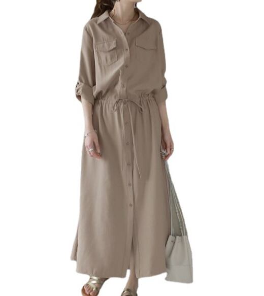 2025年秋冬新作 和風ポケット付き長袖ミドル丈カジュアルラペルワンピースシャツワンピース341