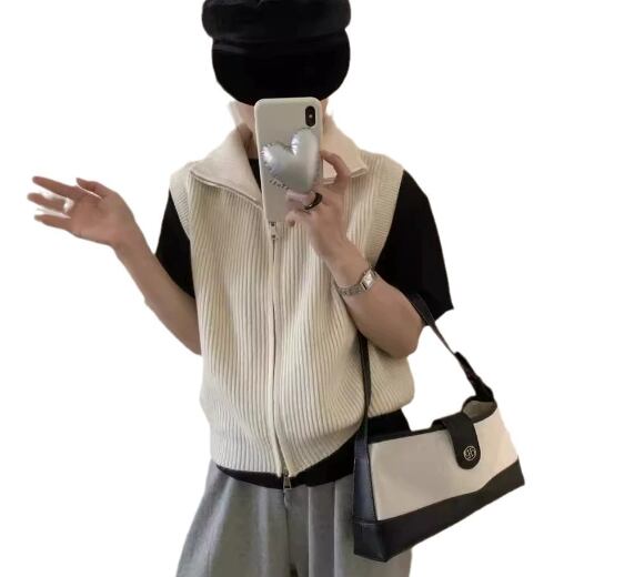 無地スタンドカラーシンプルなダブルジッパーデザインゆったりレイヤードトップスレディースベーシックニットベスト351