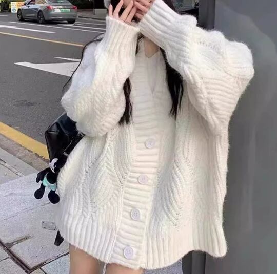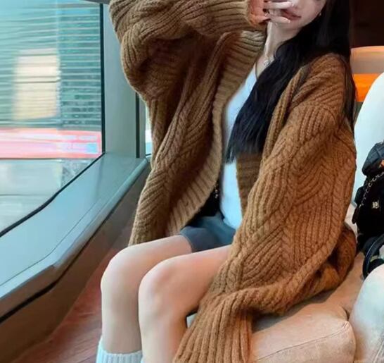 クロスボーダーレトロケーブルニットカーディガンVネックトップス秋冬新作ゆったりレイジースタイルソフトワックスセータージャケットレディース356