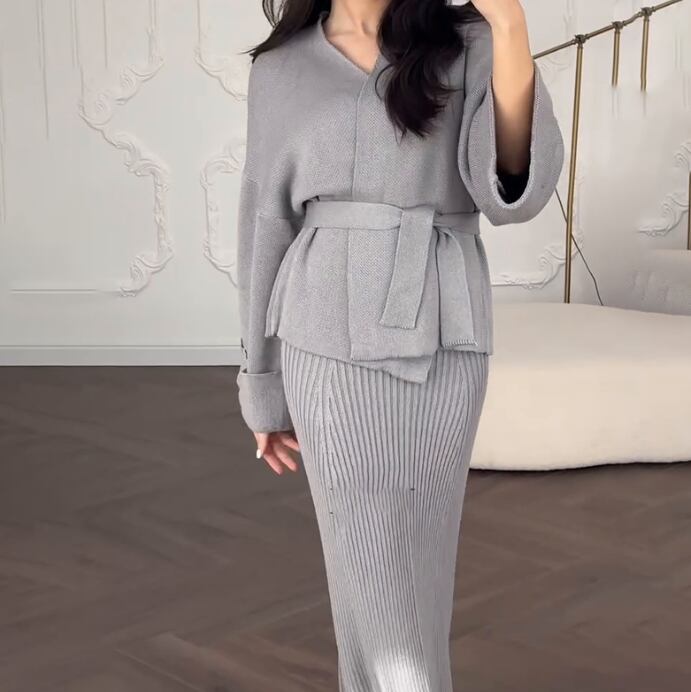 クロスボーダーVネックレースカーディガンゆったりコートニットセーターツーピースセット373