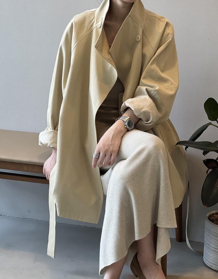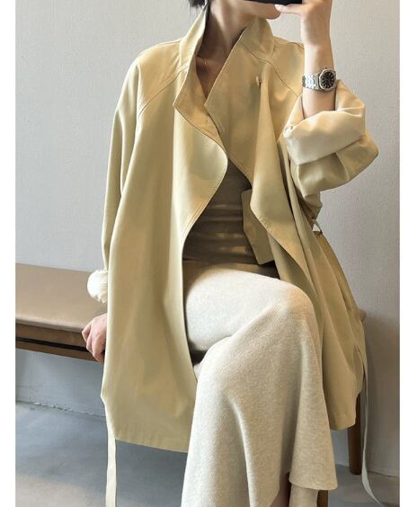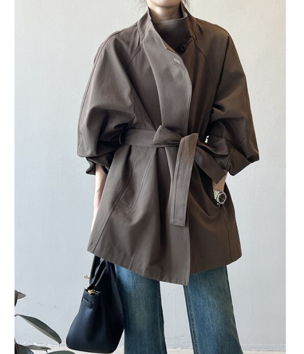 スタンドカラートレンチコート、レディース春秋レトロタイウエストミドル丈コート、小さいサイズゆったりコート379