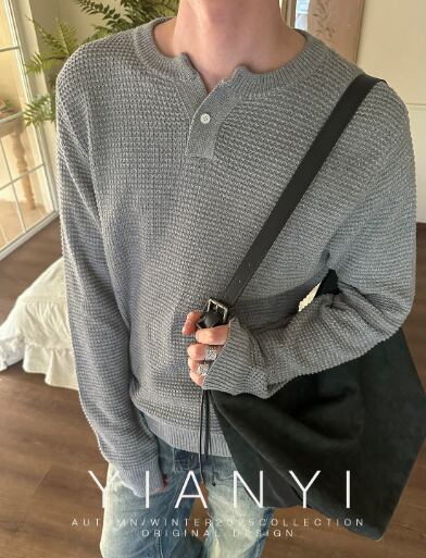 レトロ オールドマネー ワッフル 小さめ Vネック 長袖 Tシャツ 男女兼用 秋 ゆったり レイジー ヘンリーカラー ニットセーター397