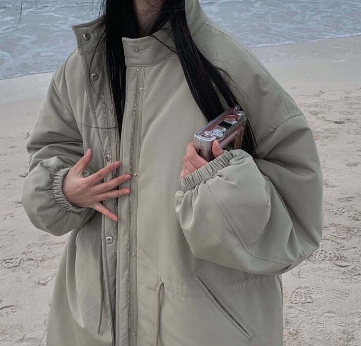 韓国風のシックな冬物レイジースタイルのワークウェアパーカー、ゆったりとした大きめのドローストリングスタンドカラーのコットンジャケット、暖かいコットンロングコート406