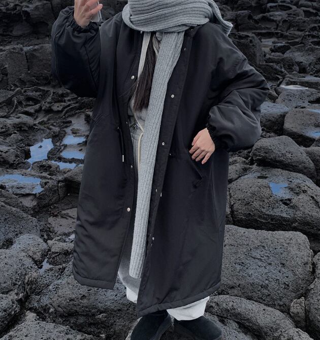 ゆったりとしたドローストリングスタンドカラーが顔周りを優しく包み込み、寒い季節でも暖かさを提供します。コットン素材なので、肌触りも良く、快適な着心地を実現しています。さらに、シンプルでありながら存在感のあるデザインは、カジュアルなスタイルはもちろん、少しカジュアルなお出かけにも対応できます。