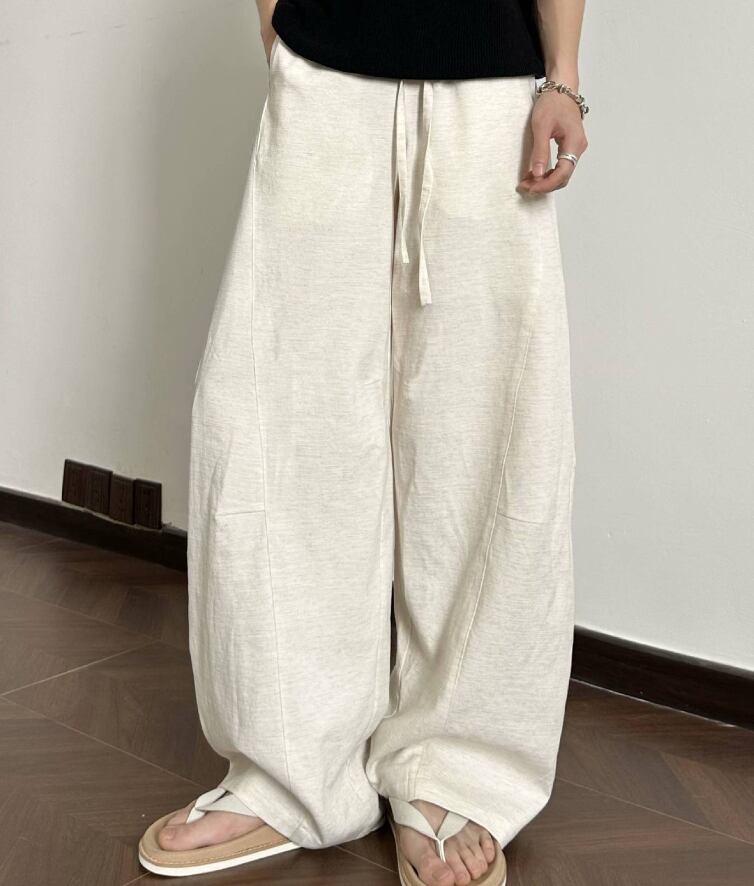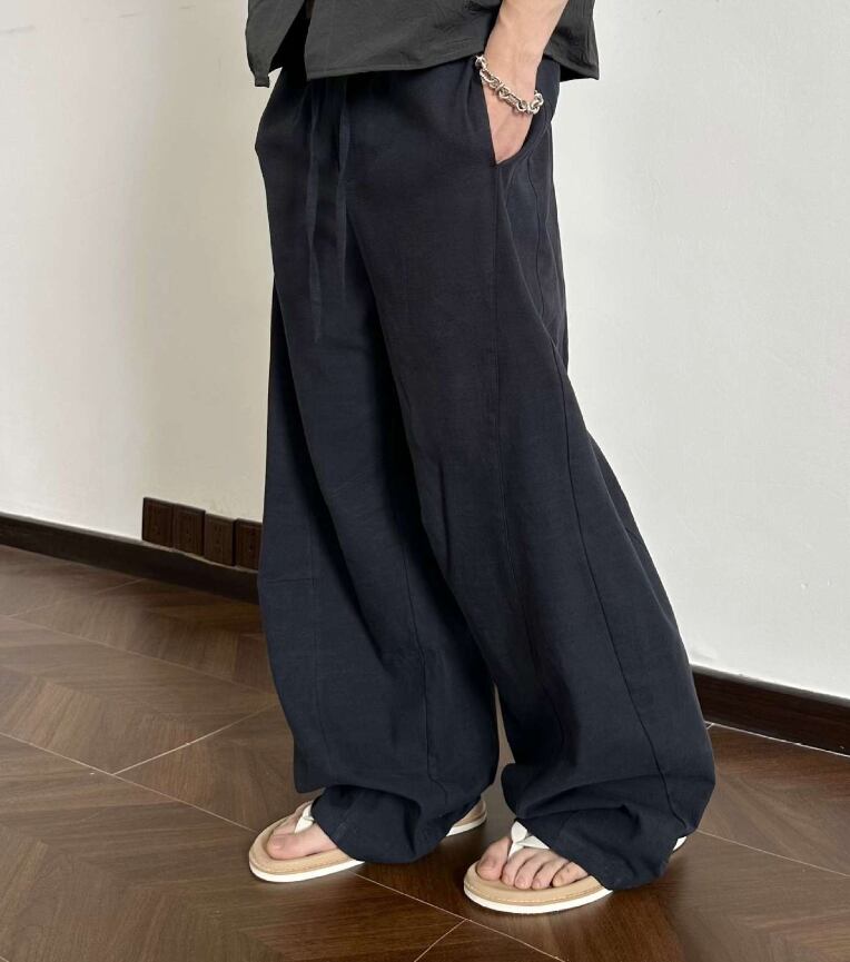 メンズ ルーズフェイクドレープ リネンブレンド トラウザーズ カーブカット ルーズで快適なレイジーワイドレッグパンツ421