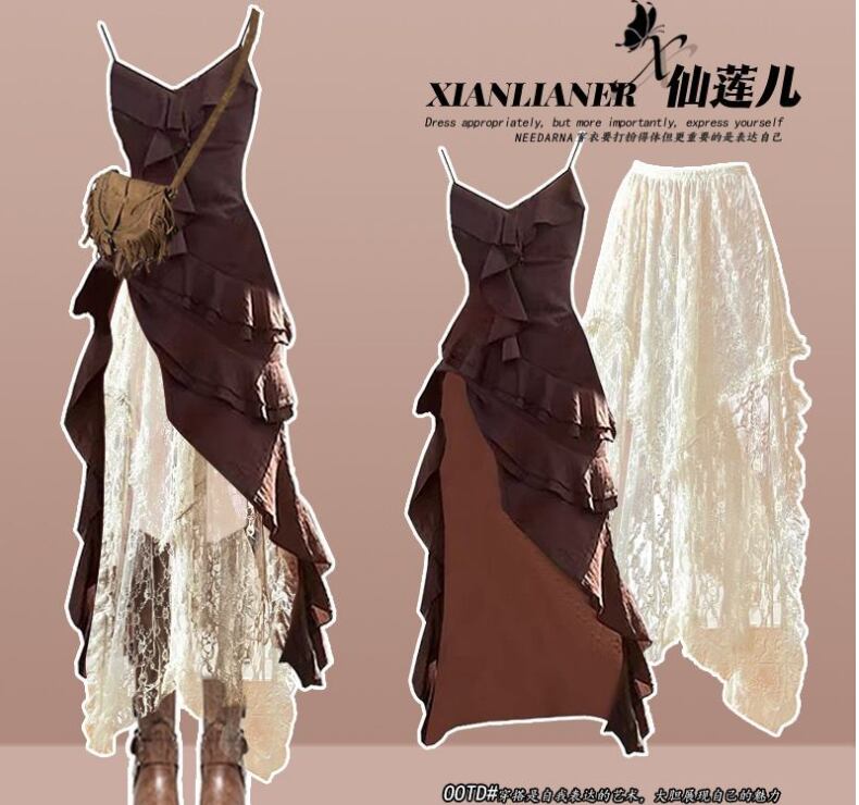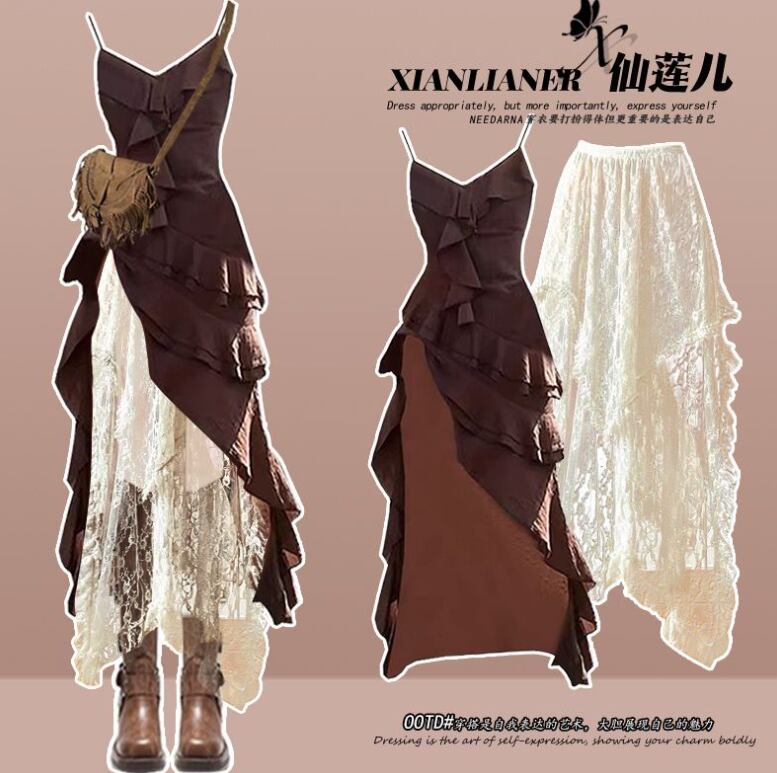 摩耗スリットレトロサスペンダードレスとレースのスカートツーピーススーツ434