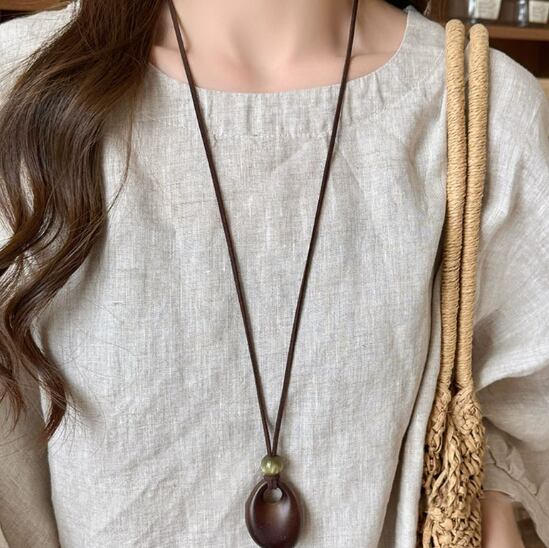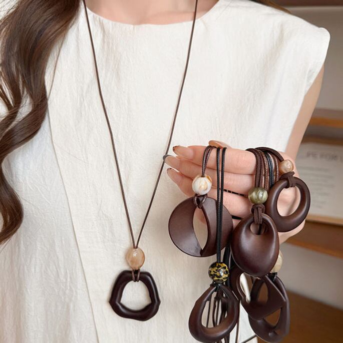 秋冬レトロ木製樹脂ラウンドペンダントネックレス、軽量高級ハイエンドセーターチェーン、シンプルでスタイリッシュ、万能ネックレス592