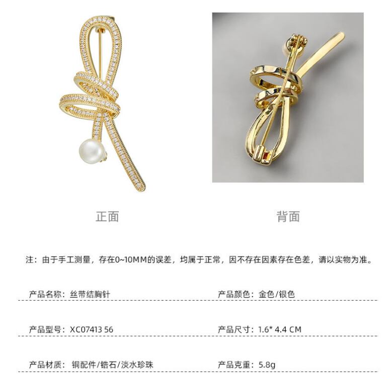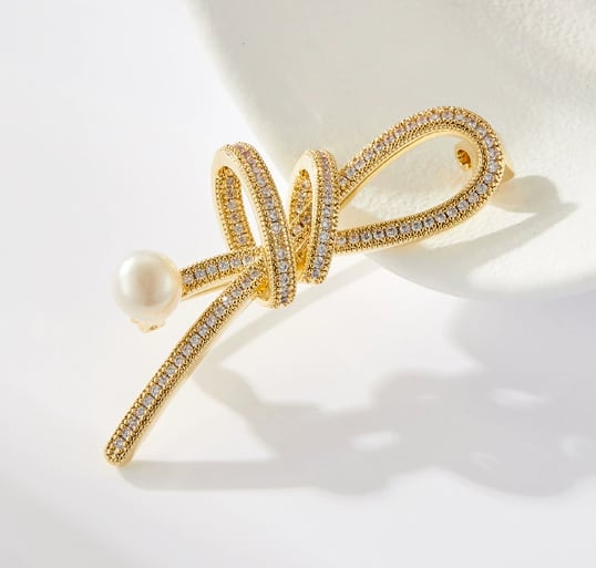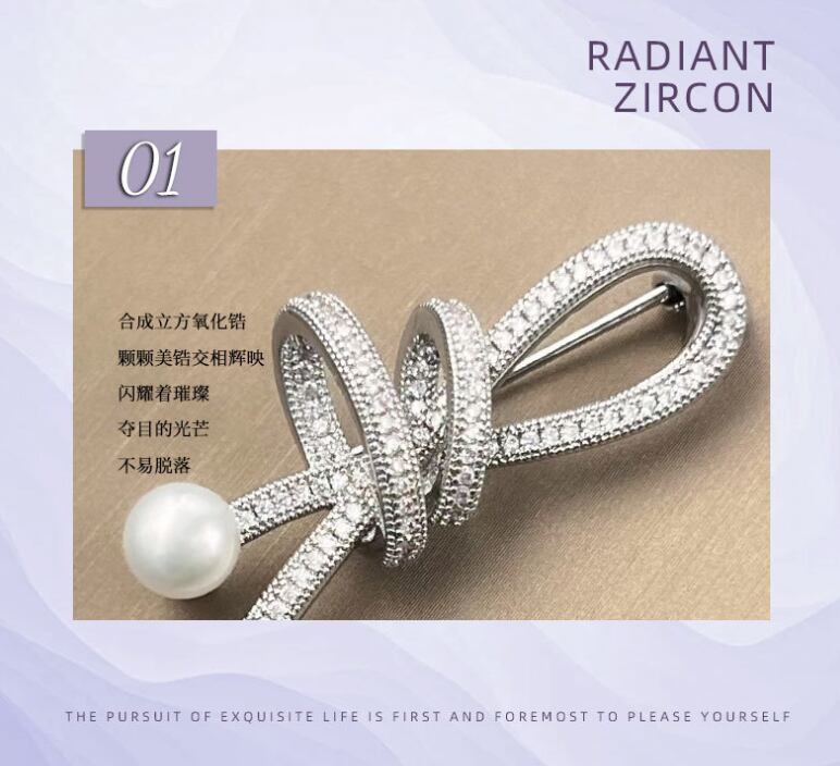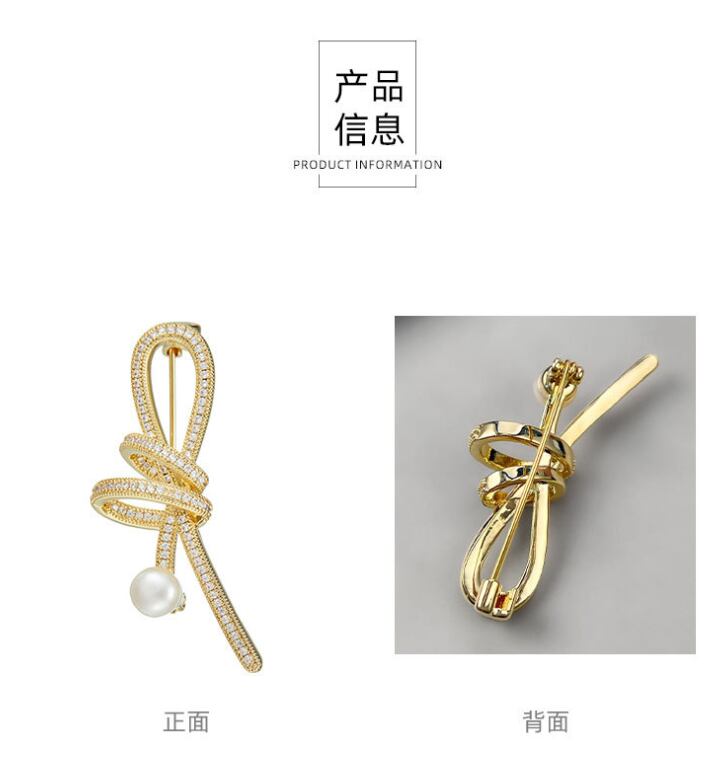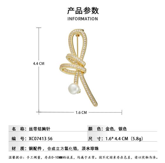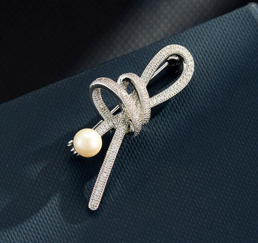 女性用可愛い綺麗スタイリッシュでエレガントマイクロインレイジルコンのリボンブローチ淡水真珠614