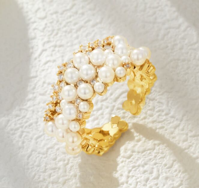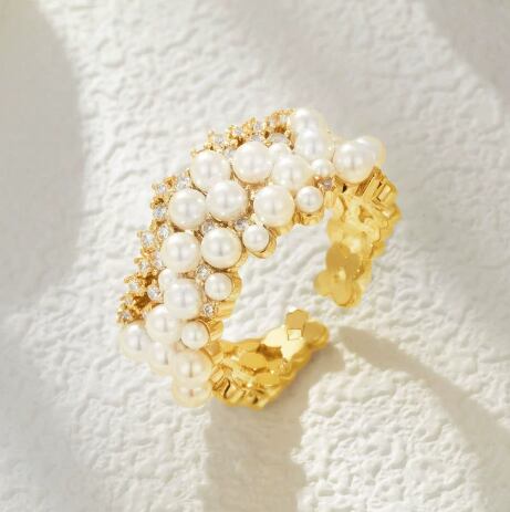 新しい高級パールとジルコンのオープンリング、ヴィンテージエレガンス、ユニークな人差し指リング、調節可能で繊細なバンド616