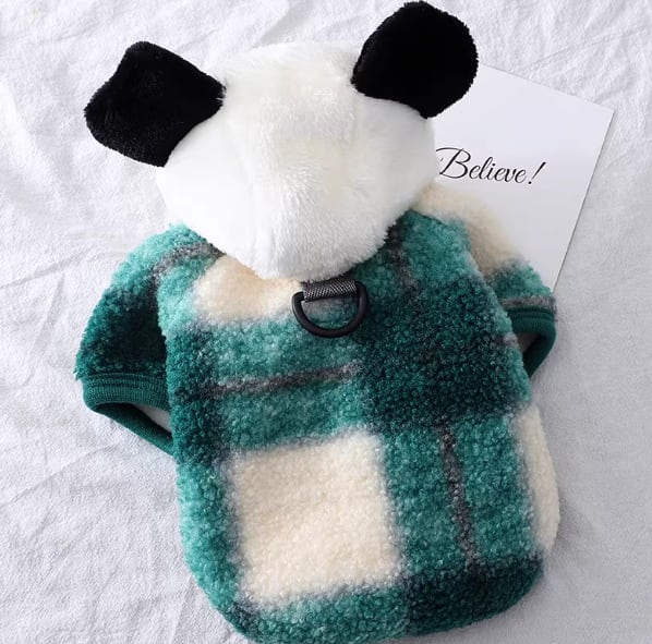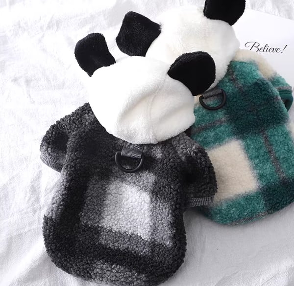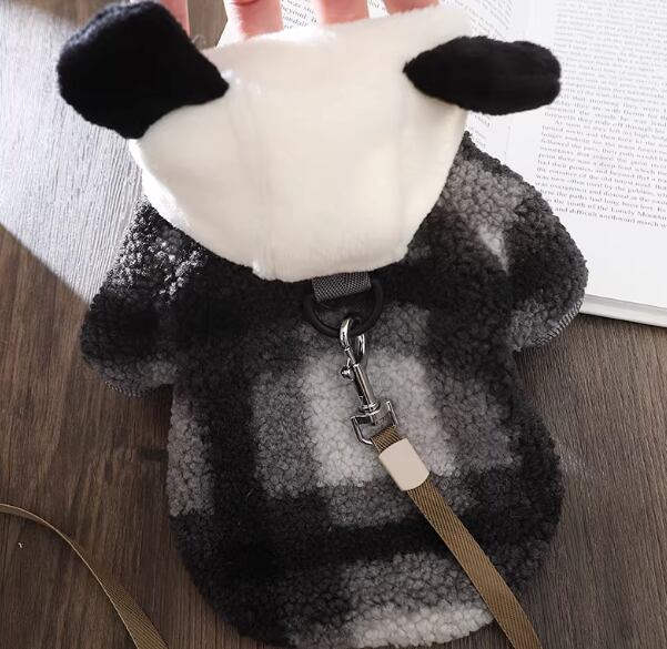 子犬用服(リード付き)、白黒パッチワークフリースセーター、冬用暖かいフード付きコットンセーター719