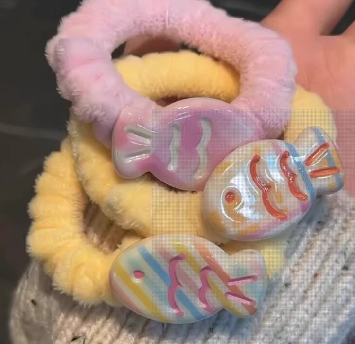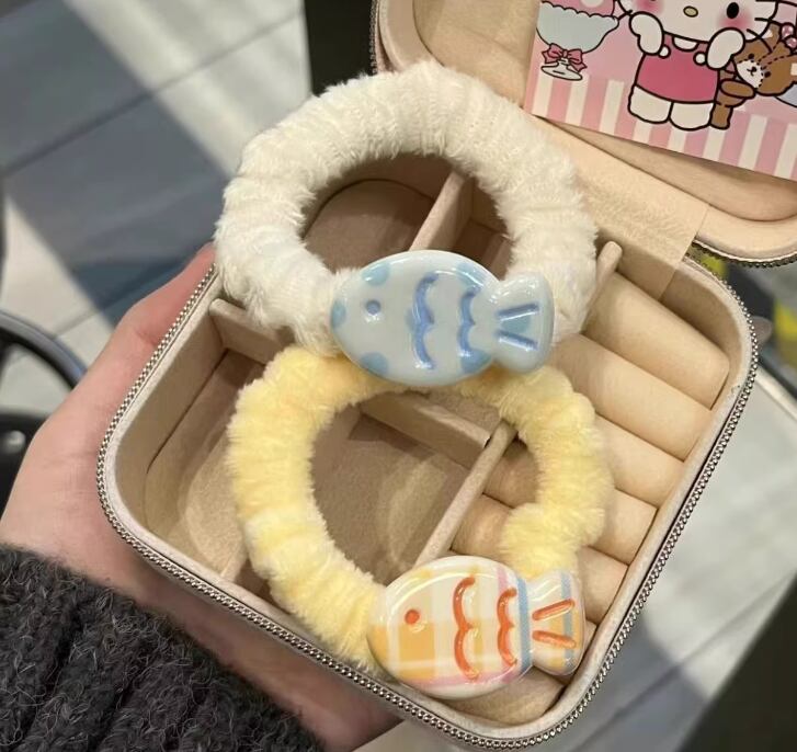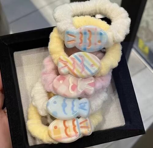 かわいいクリーミーな魚のヘアタイ、布製ベルベットのヘアロープ、シンプルな髪の結び方、カラフルな魚745