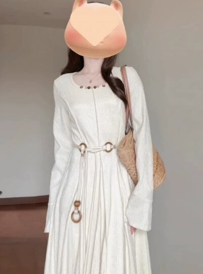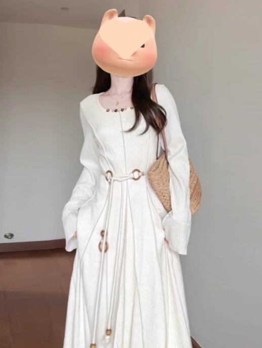 早春,優しいホワイトのフレンチスクエアネック長袖レディースドレス782