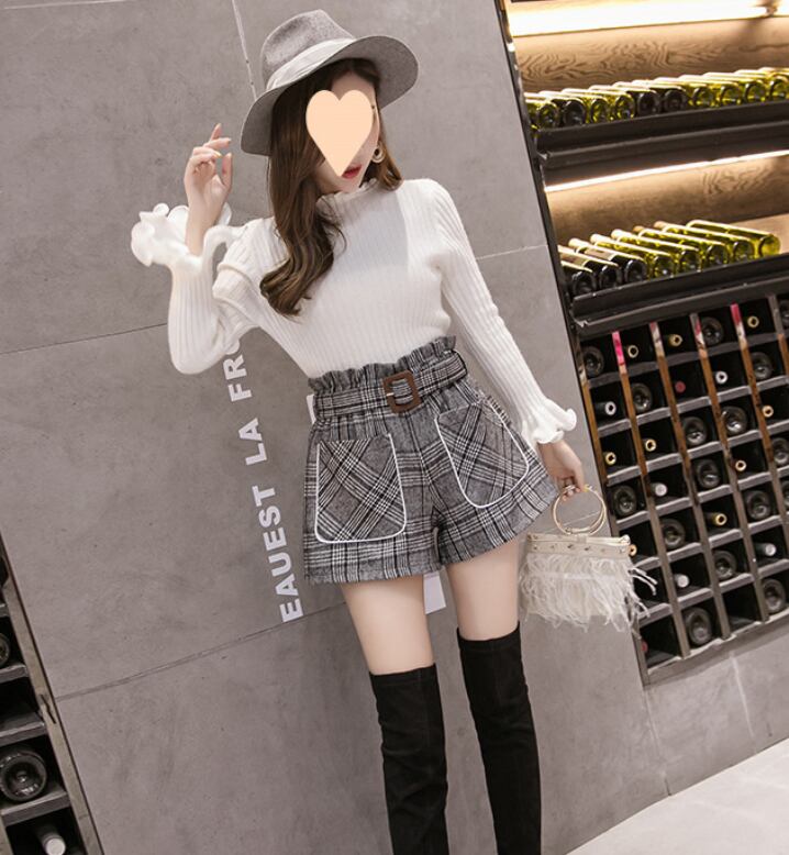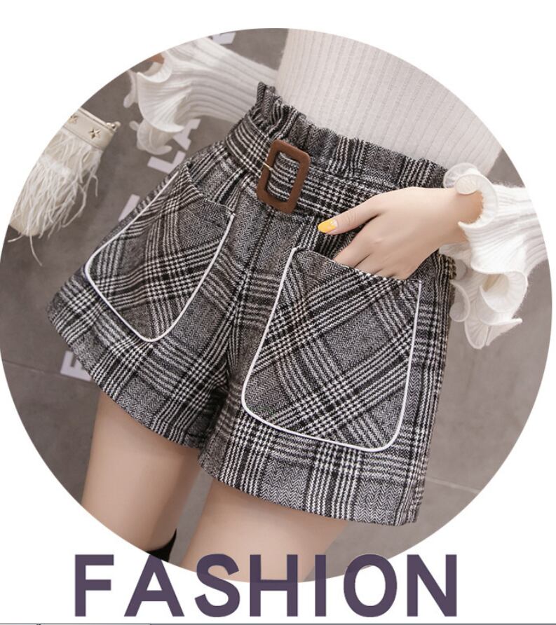 レディースチェック柄ウールショートパンツ ハイウエストワ788