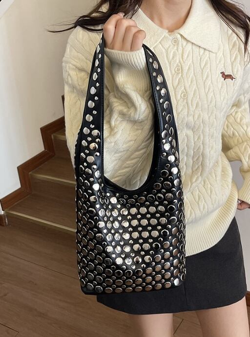 【特徴】 この「トレンディでクールな水玉模様のスタッズ付き脇下バッグ、欧米風、多機810」は、スタイリッシュでユニークなデザインが魅力のアイテムです!水玉模様とスタッズが施されたこのバッグは、どんなコーディネートにもマッチし、あなたをおしゃれに演出します。