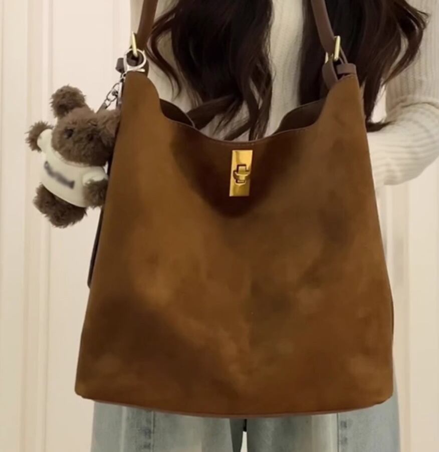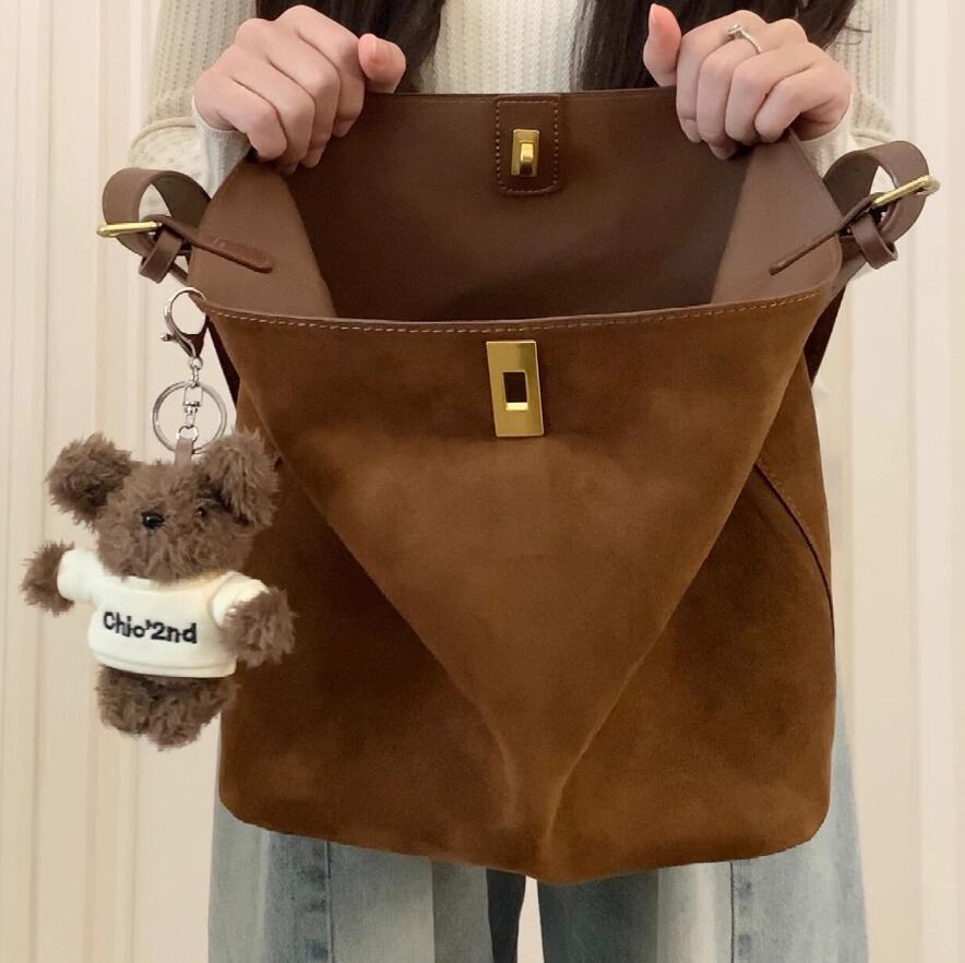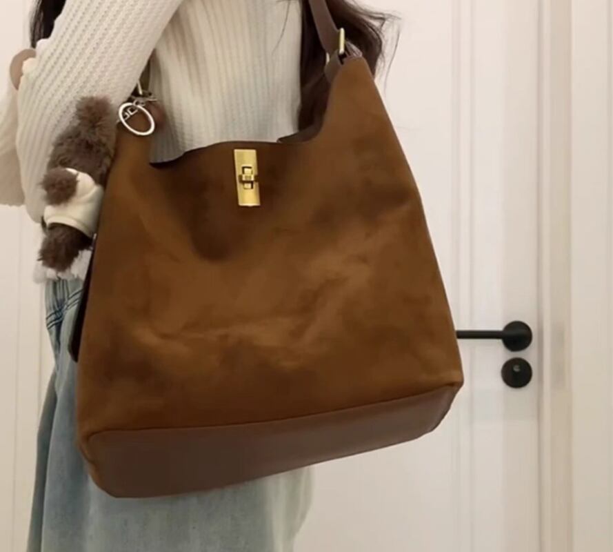 韓国風通勤用バケットバッグ、女性用、秋冬、高級スエード、レトロファッ851