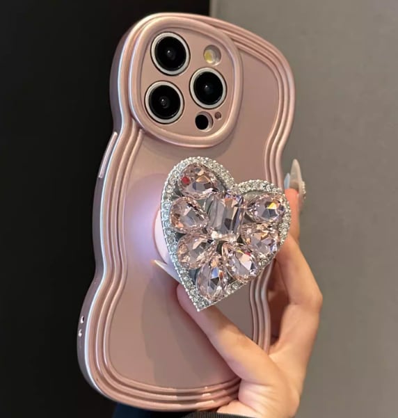 iPhone 16 Pro Max iPhone14 Pro、新型 Apple 13 Pro Max 用プレミアムピンク 3D ハート ラインストーン スタンド1073