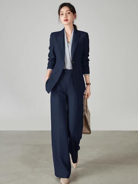 高級感のあるネイビーブルーのプロフェッショナル向けフォーマルスーツセット(女性用)。ストレートレッグのパンツとエレガントなツーピーススーツ1100